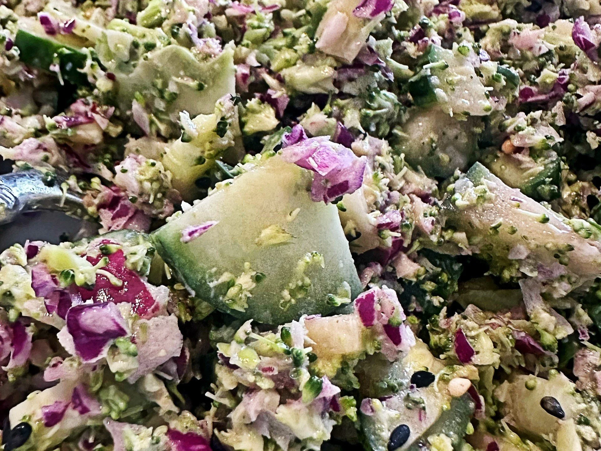 Riced broccoli, cucumber, red onion and red cabbage - visually stunning and PERFECT with creamy Asian dressing!