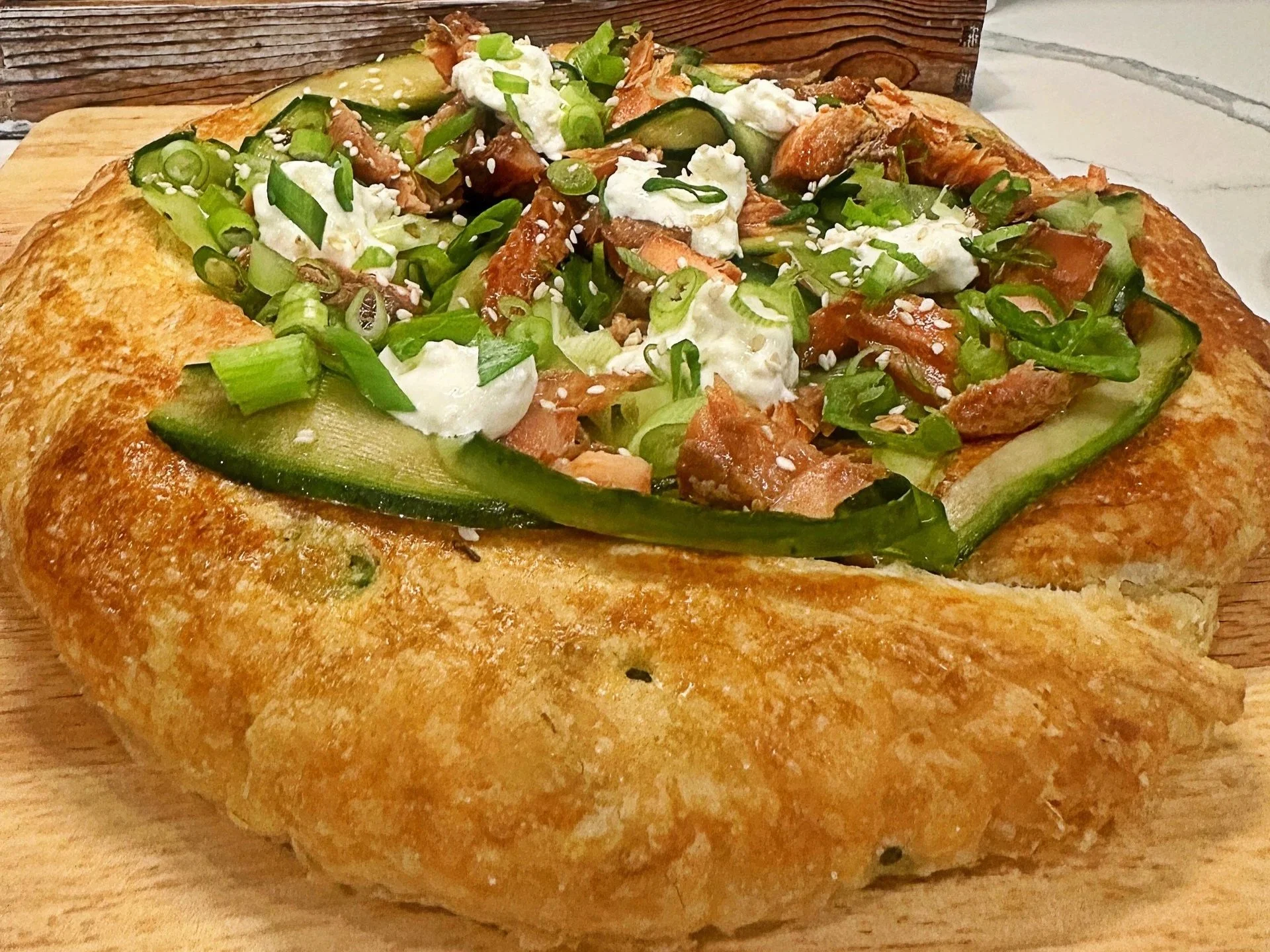 Flaky puff pastry is rolled and spiraled into a sesame-scented scallion pancake crust, then topped with citrusy cucumber ribbons, smoked salmon, cream cheese, and a katsu drizzle for a playful, sliceable twist on pizza.